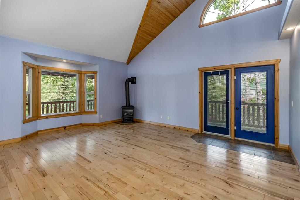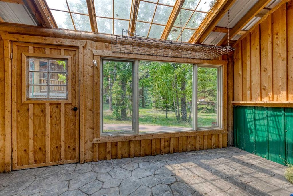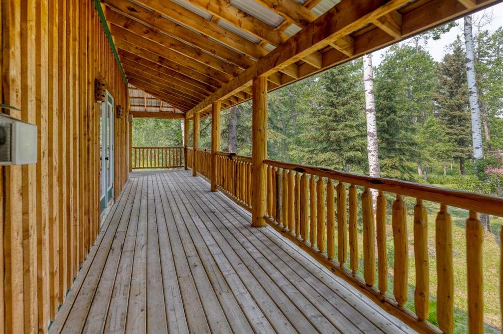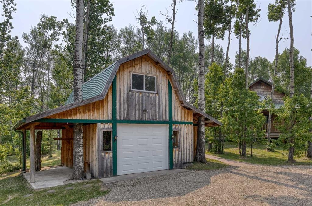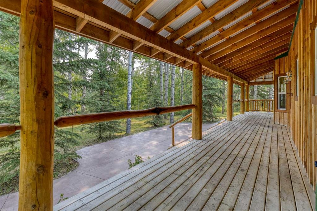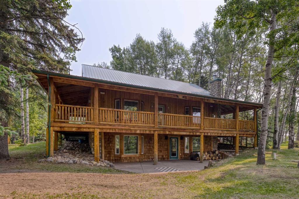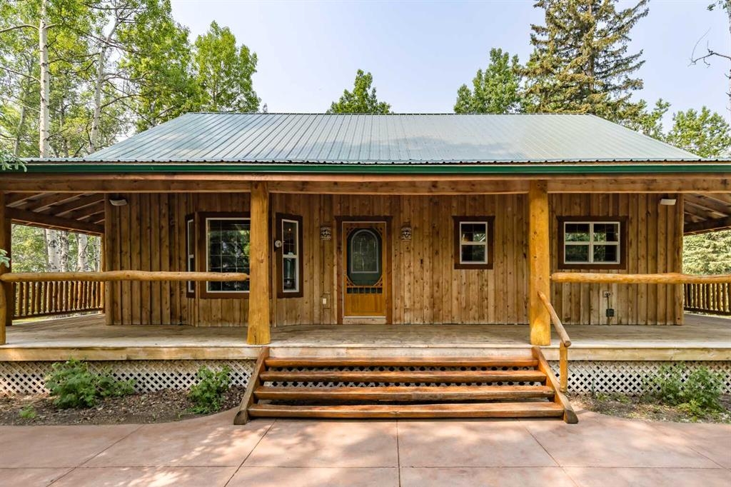 Tucked away in a serene, park-like setting right off Highway 22 and surrounded by mature trees, this unique property offers the perfect blend of rustic charm and practical functionality. The home is a rustic bungalow with a warm Southwestern feel, featuring over 2,278 sq ft of developed living space, a walkout basement, soaring vaulted ceilings, in-floor heat, a cozy wood-burning stove, a gas fireplace, and a gas stove—creating an inviting and comfortable atmosphere throughout. A sprawling 1,350 sq ft wrap-around porch embraces the home, offering the ideal space to relax, entertain, and take in the natural beauty of the surroundings.