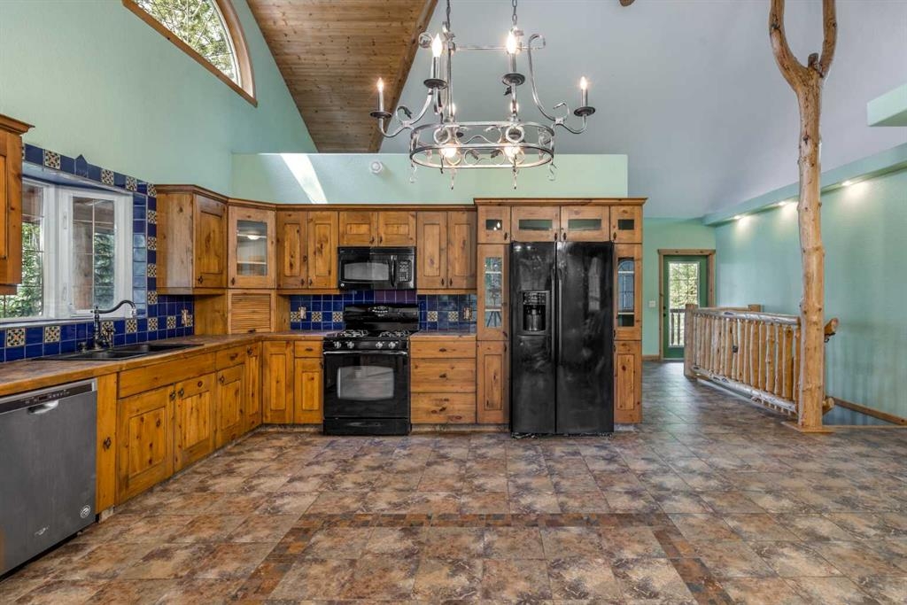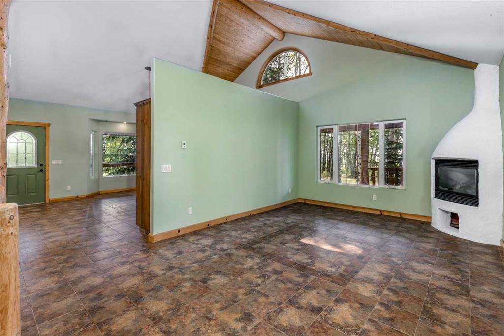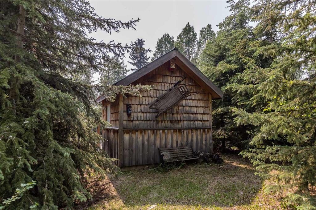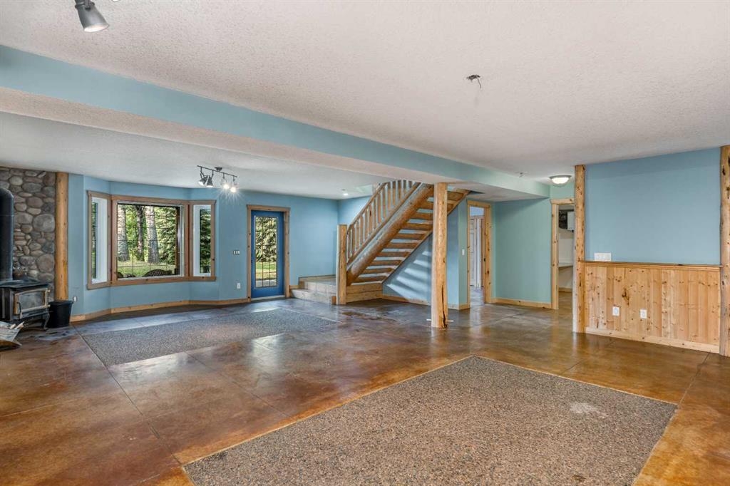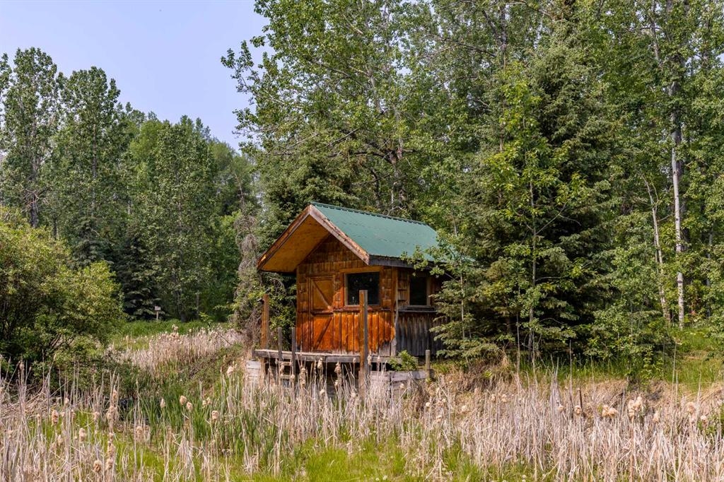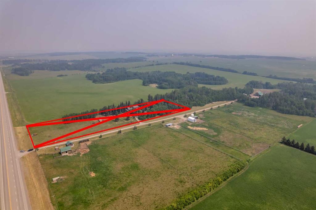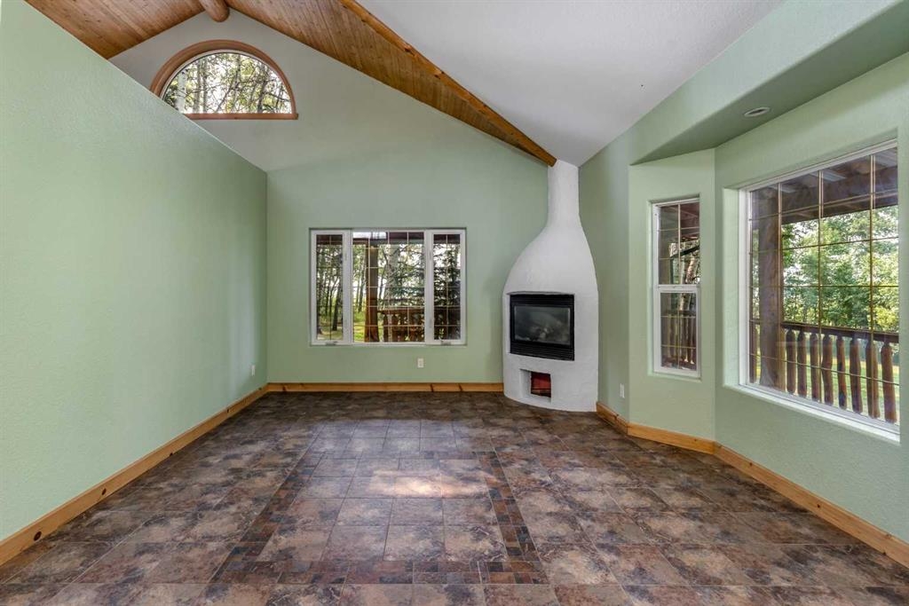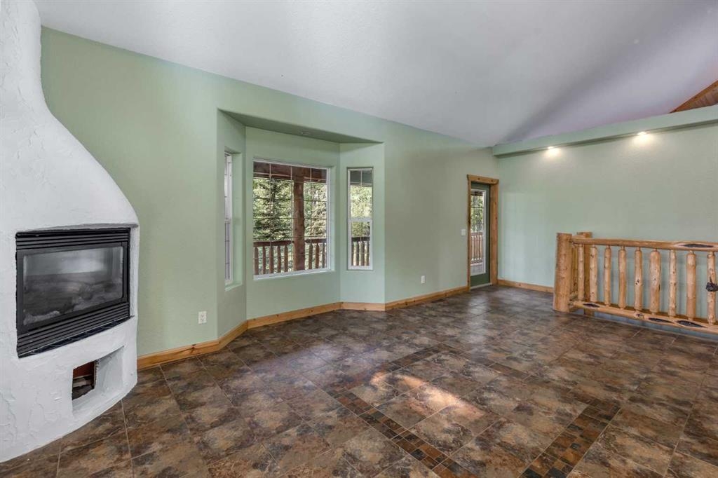 Tucked away in a serene, park-like setting right off Highway 22 and surrounded by mature trees, this unique property offers the perfect blend of rustic charm and practical functionality. The home is a rustic bungalow with a warm Southwestern feel, featuring over 2,278 sq ft of developed living space, a walkout basement, soaring vaulted ceilings, in-floor heat, a cozy wood-burning stove, a gas fireplace, and a gas stove—creating an inviting and comfortable atmosphere throughout. A sprawling 1,350 sq ft wrap-around porch embraces the home, offering the ideal space to relax, entertain, and take in the natural beauty of the surroundings.