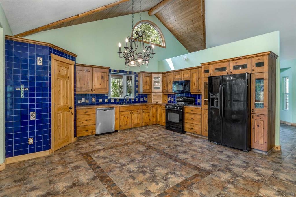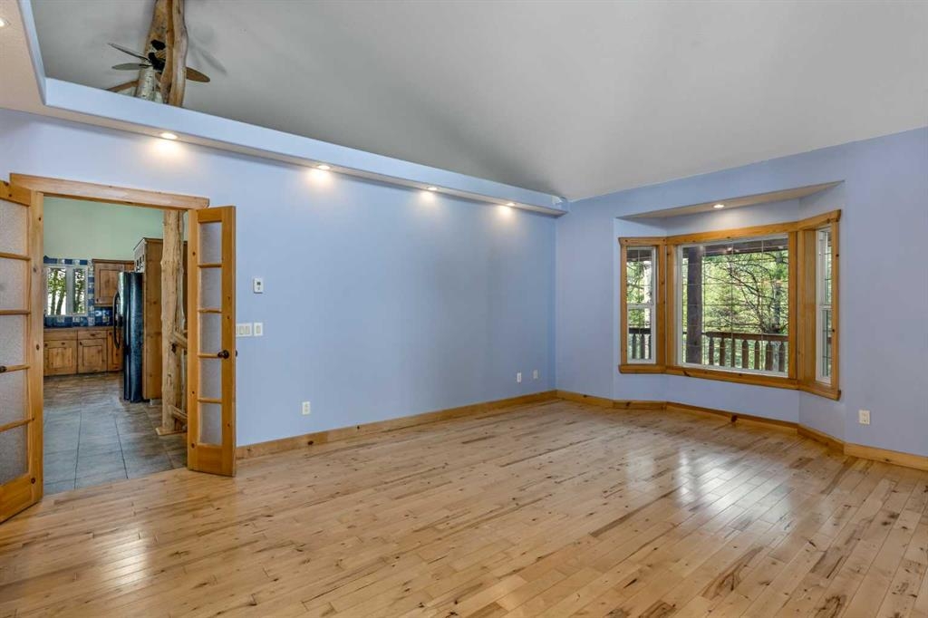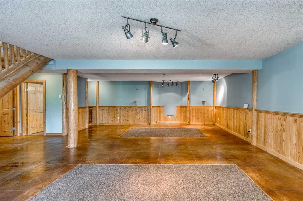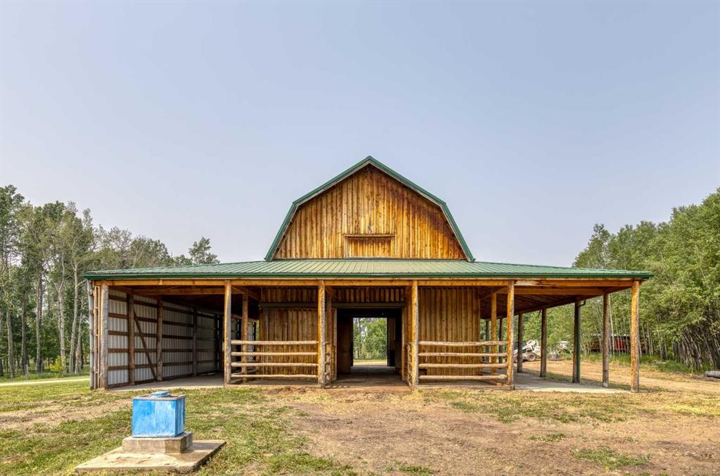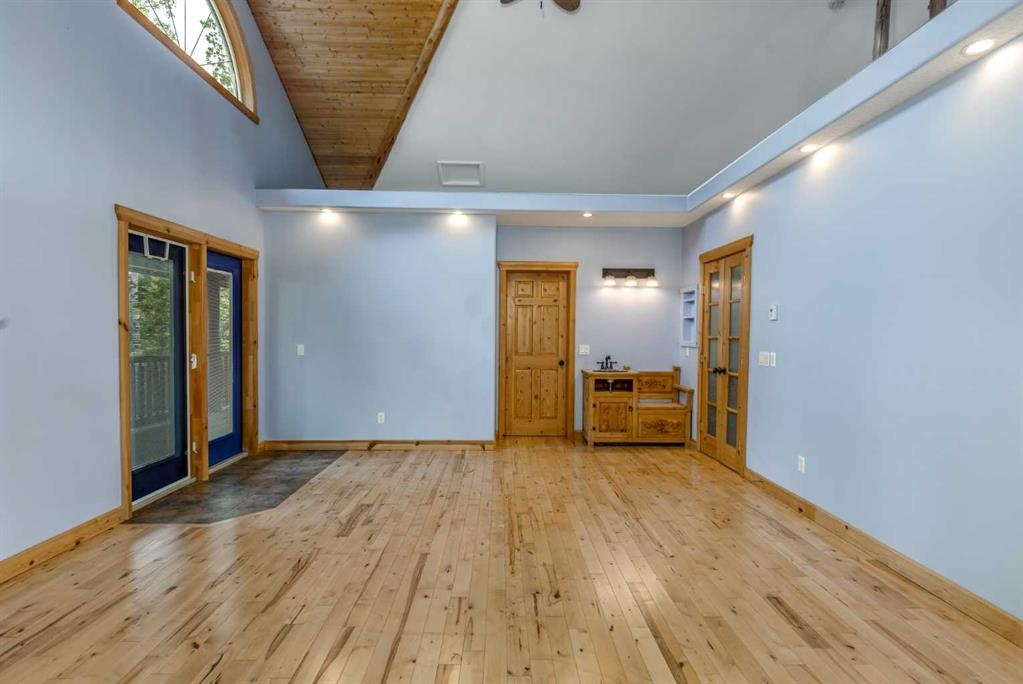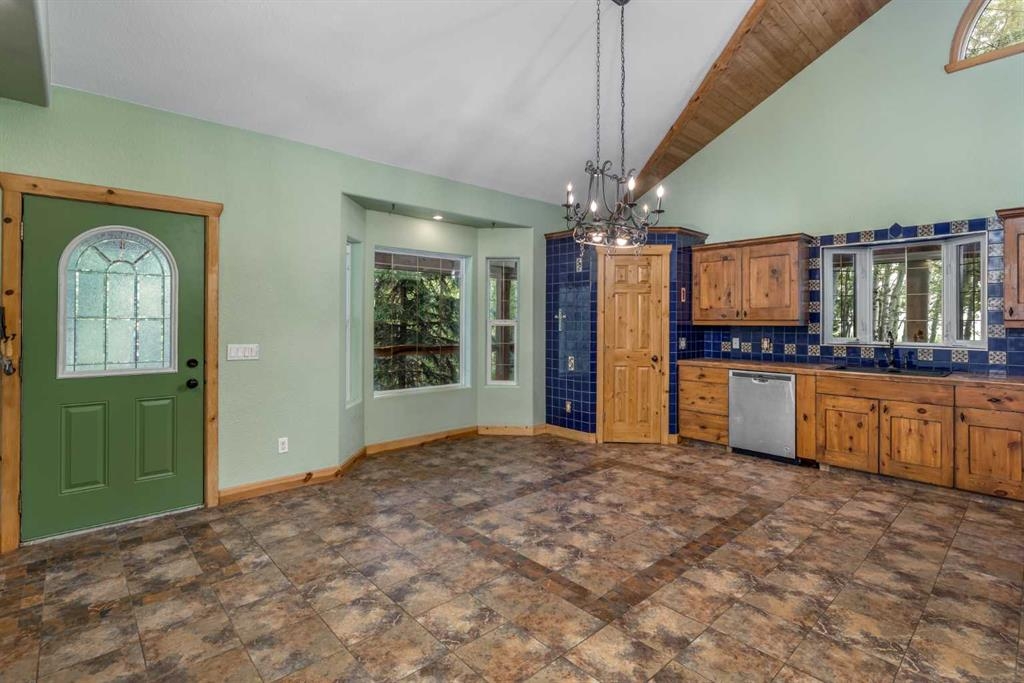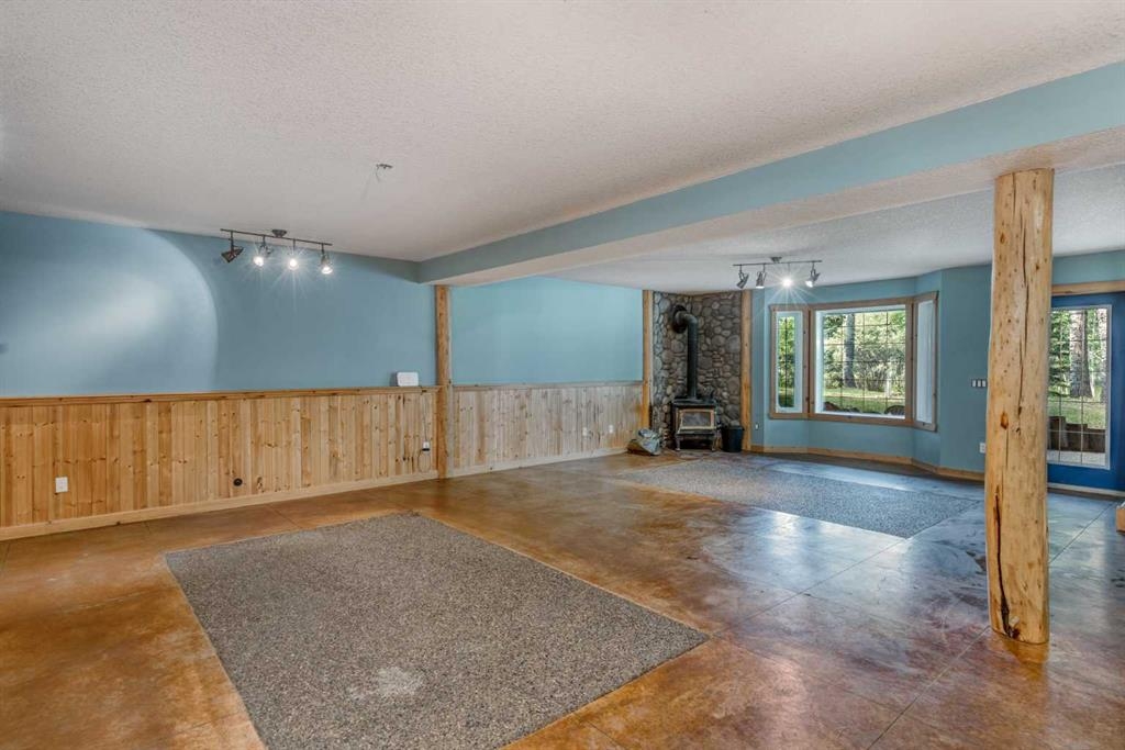 Tucked away in a serene, park-like setting right off Highway 22 and surrounded by mature trees, this unique property offers the perfect blend of rustic charm and practical functionality. The home is a rustic bungalow with a warm Southwestern feel, featuring over 2,278 sq ft of developed living space, a walkout basement, soaring vaulted ceilings, in-floor heat, a cozy wood-burning stove, a gas fireplace, and a gas stove—creating an inviting and comfortable atmosphere throughout. A sprawling 1,350 sq ft wrap-around porch embraces the home, offering the ideal space to relax, entertain, and take in the natural beauty of the surroundings.